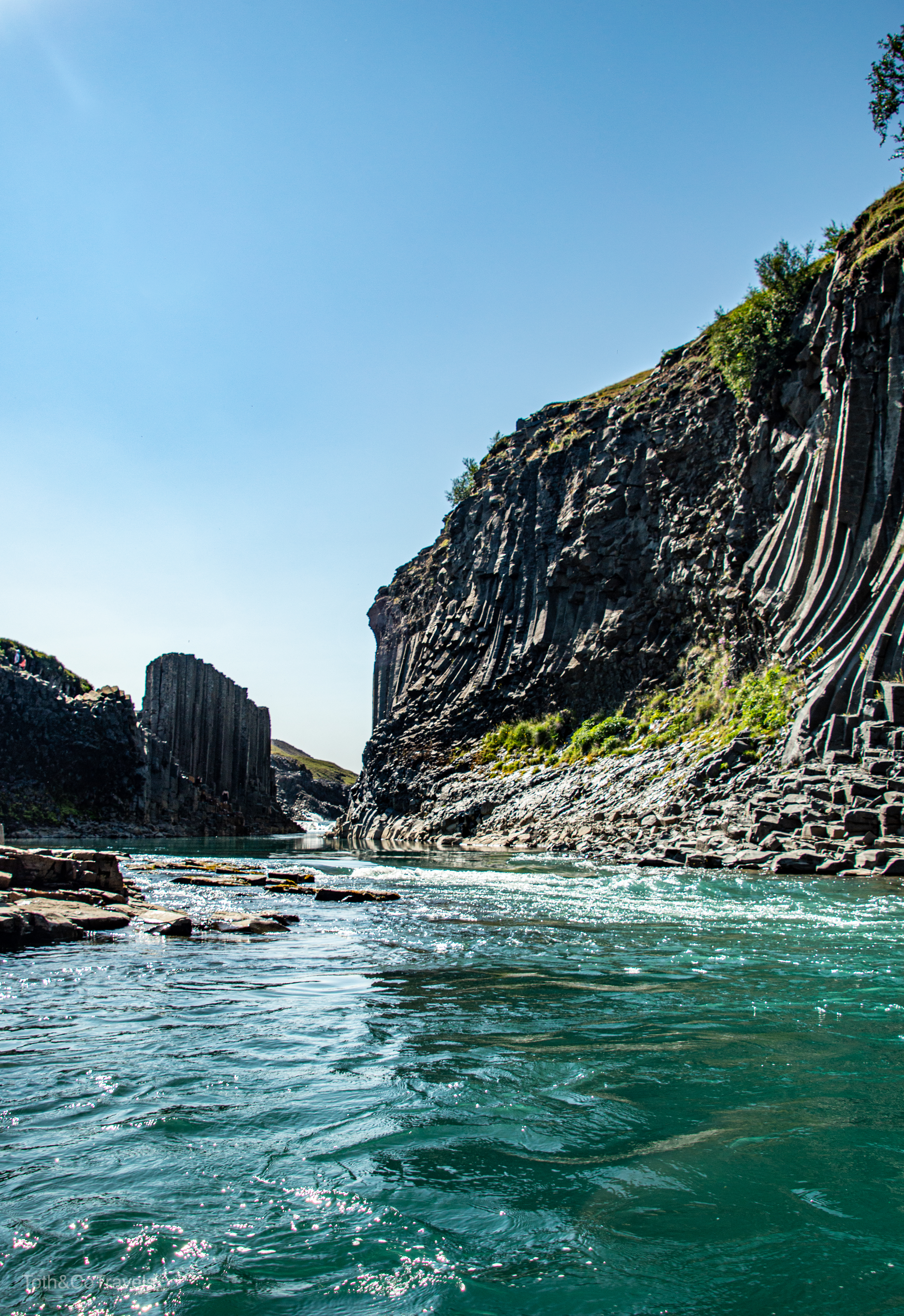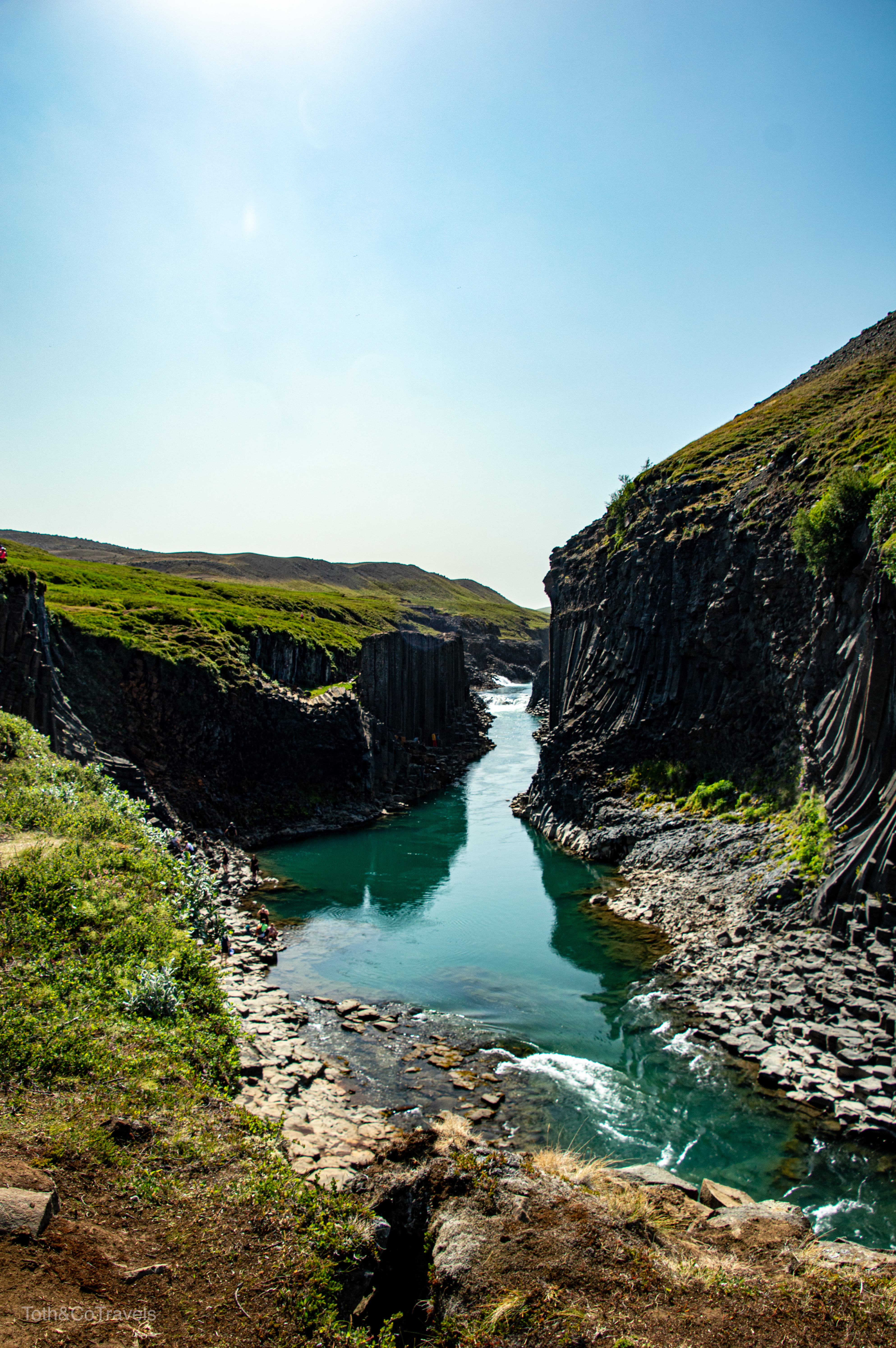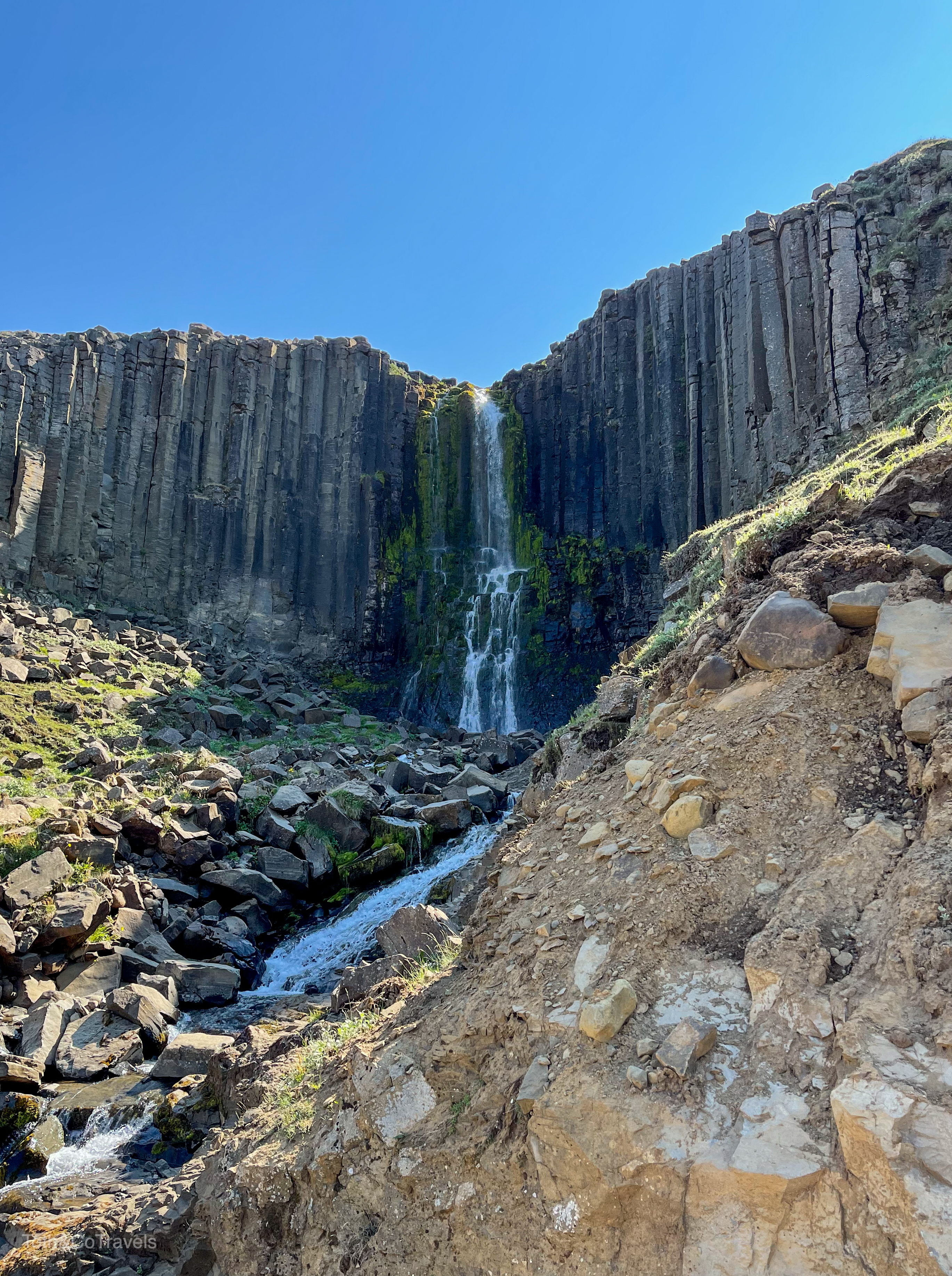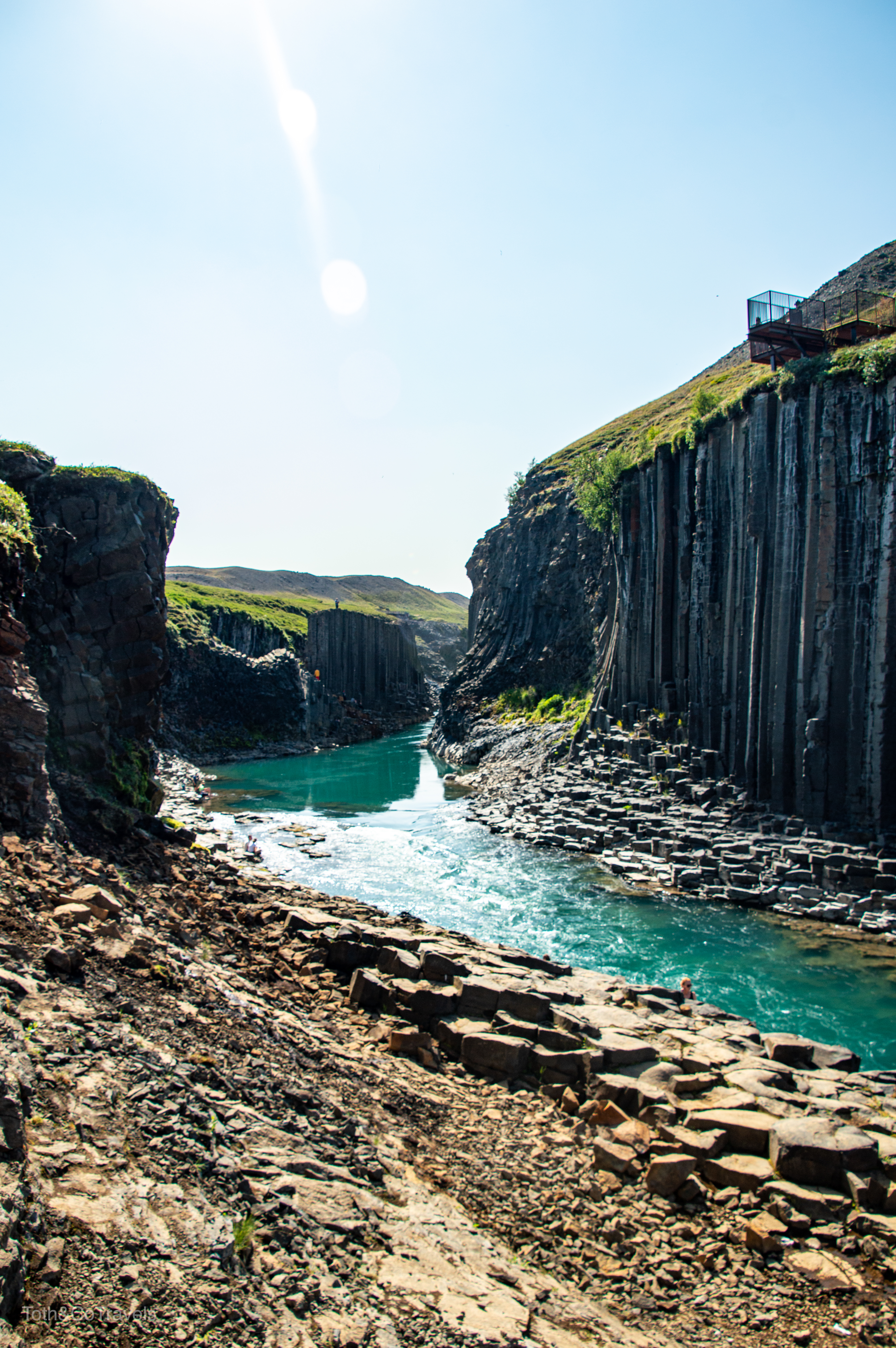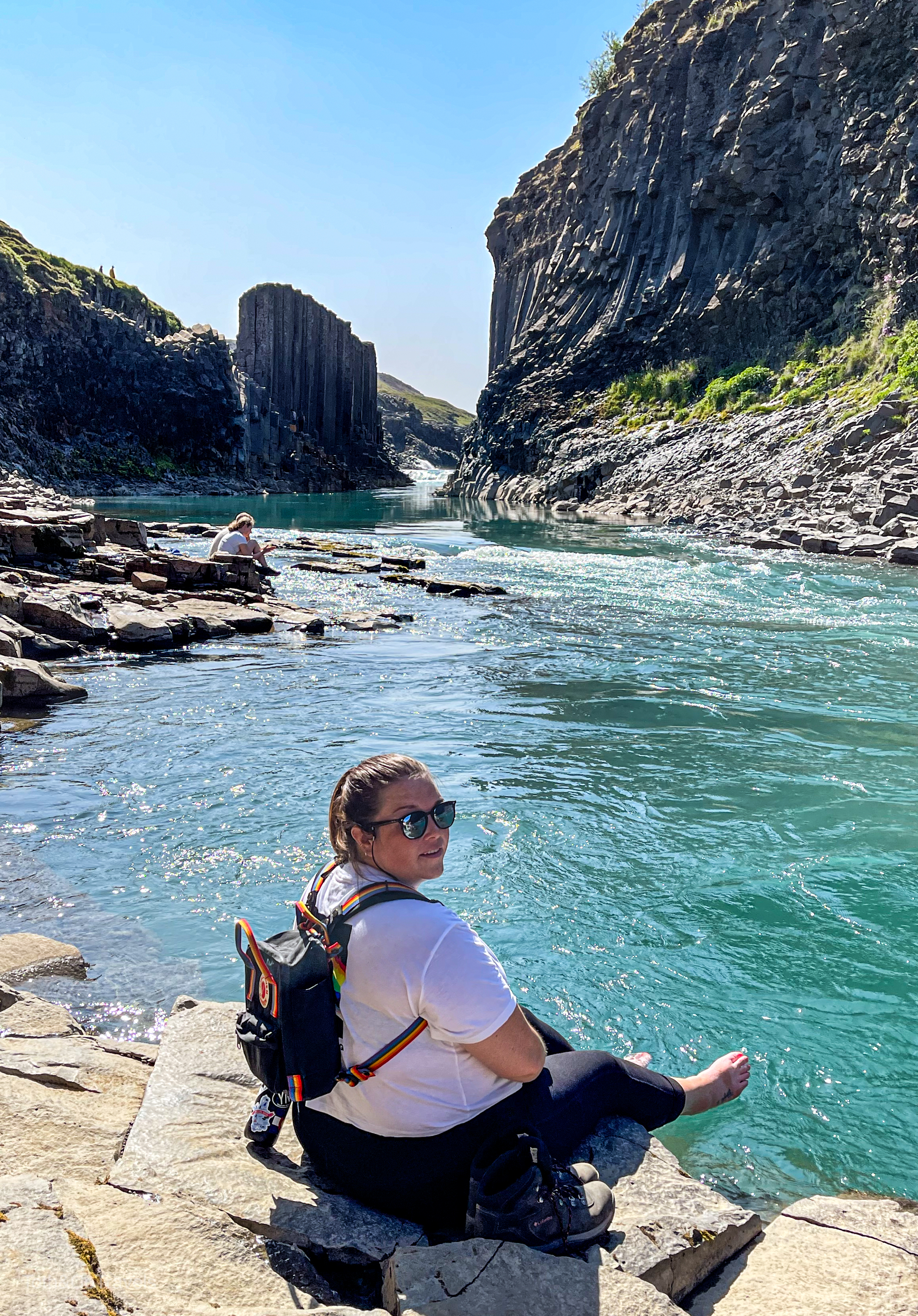 Well that wraps up our time in/around Húsavík, on to the next! Our next destination was Höfn, but once you cross into the Eastern Region of Iceland there’s SO MUCH to see (as if there wasn’t already everywhere else). On our way across, it was on the list to stop at Studlagil Canyon. This proved to be stressful/annoying but in the end worth it. So on google maps, if you put in Studlagil Canyon, it will take you to the parking lot with toilets and a staircase that goes down… not fully to the canyon. This also involves a long, scary (to me anyways) dirt road. While we did need the toilets, this was not where we wanted to be. Eventually, we figured out we needed to go all the way back out a way and cross a bridge to the other side of the canyon, where you will find a parking lot. You will then need to walk not .9 miles as the sign on the other side says, but about 1.5 miles each way to get down to the water. But once we finally got down there, it was worth it. It was actually pretty warm that day, so we just sat with our feet in the water for a while before we took the trek back to the car.