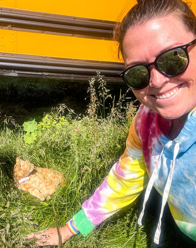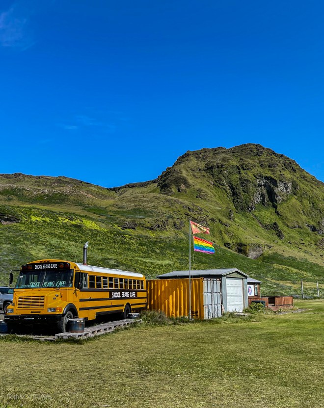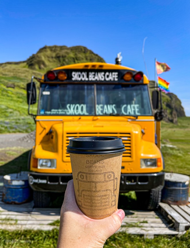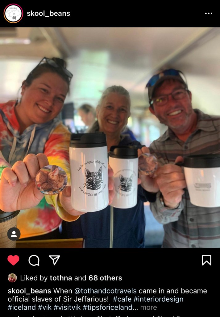 Once we stopped staring at the glacier, we made our way to Vík. Honestly I was most excited about Vík because I had seen a cafe in a school bus where a 3 legged legend of a cat lived and I HAD TO GO. Well, everything about Skool Beans lived up to the hype in my mind. Delicious coffee, such a cute little cafe, SIR JEFFARIOUS (the cat) and his merch. Seriously, we bought so much merch they put us on their Instagram.